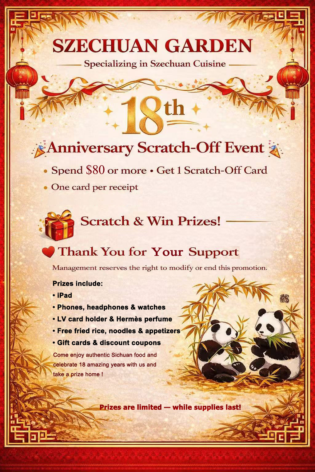 Szechuan Garden Restaurant has APPETIZERS, SOUPS, CHEF'S SPECIAL, SEAFOOD, POULTRY, BEEF AND LAMB, PORK, VEGETABLES, FRIED RICE, LO MEIN, RICE NOODLES, EGG FU YOUNG, SOFT DRINKS, SEAFOOD LUNCH SPECIAL, POULTRY LUNCH SPECIAL, BEEF LUNCH SPECIAL, PORK LUNCH SPECIAL, VEGETABLES LUNCH SPECIAL, Delicious food. Thank you for the opportunity to serve you.